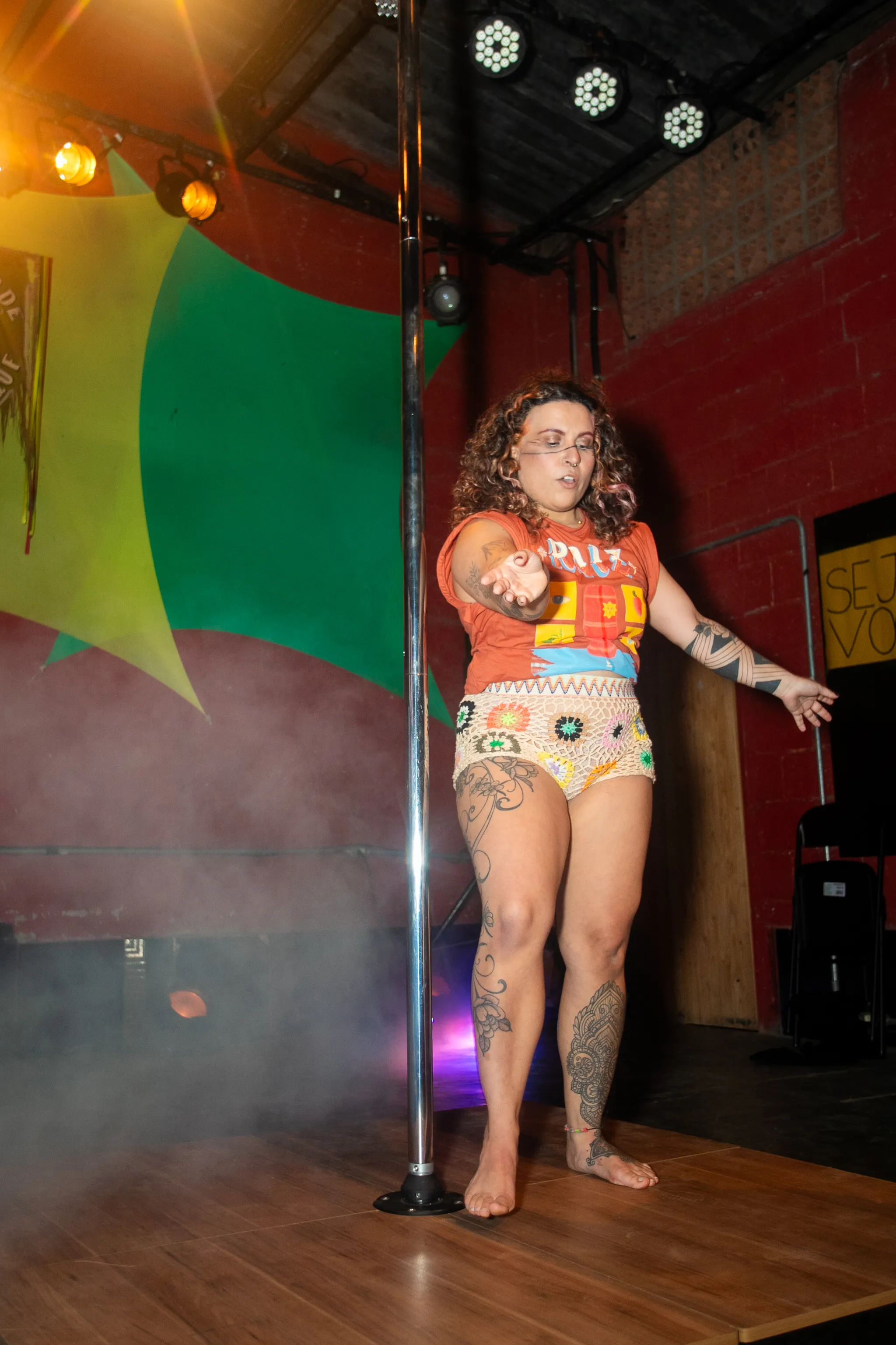 O pole é utilizado como elemento central da pesquisa, atuando como estrutura simbólica e física. Inicialmente, ele aparece como eixo de controle — um sistema ao qual o corpo se submete. Ao longo da performance, essa relação se transforma: o pole deixa de ser uma estrutura rígida e passa a ser um espaço de relação, negociação e fluxo.